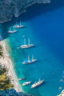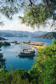 The best-known bays in the vicinity are Osman Ağa Bay, Boynuz Bükü Bay, Sarsala Bay, Domuz Island, Yavan Su Bay (Martı Bay), and Göbün Bay, the most sheltered local bay. The sunken ruins in the bay known as Cleaopatra’s Baths are near Göcek and a small pathway extending from the coast to the hills offers an unforgettable hiking experience toward the evening.